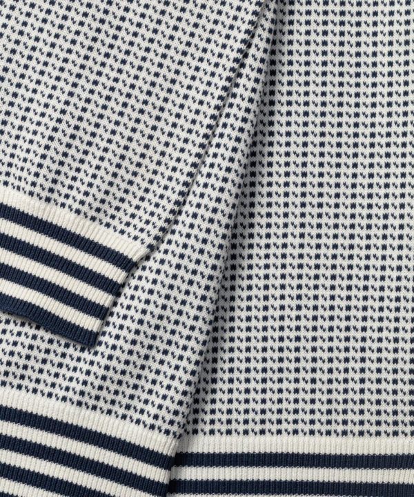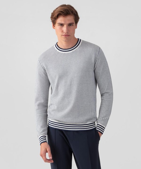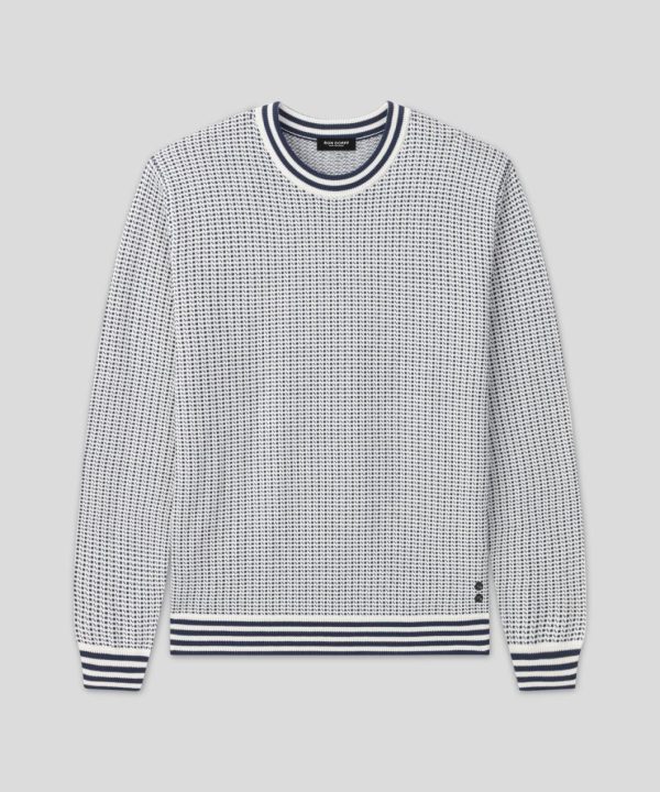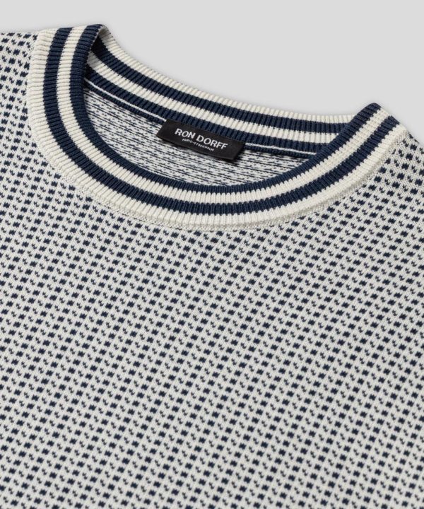 The classic Nordic sweater revisited, crafted from an ultra-soft blend of cotton and silk, and featuring a mini Nordic pattern. Ribbed finishes at the cuffs and hem ensure a clean, structured fit. Featuring the two discrete black-lacquered RON DORFF eyelets on the side.