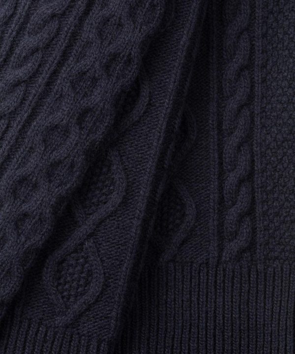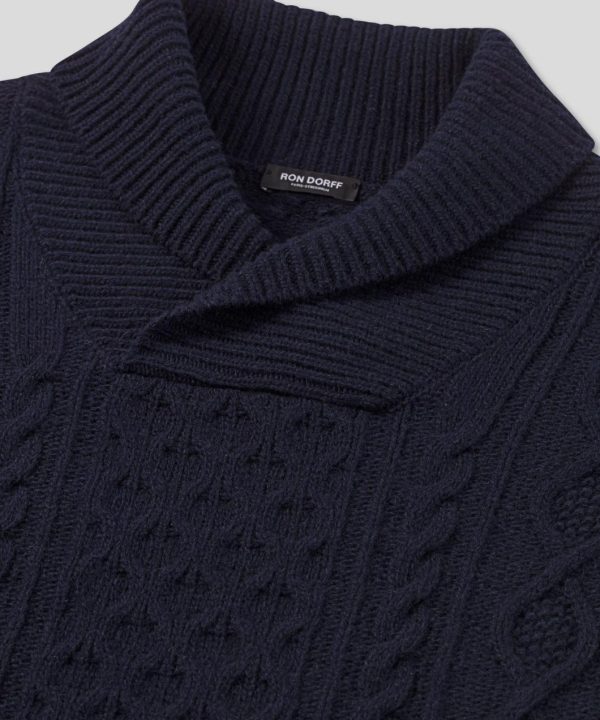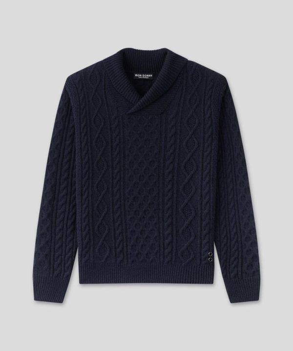 The new wool cashmere sweater of the season. Made from a rich blend of wool and cashmere, this sweater offers warmth, softness, and structure. The shawl collar adds a vintage touch that is both classic and distinctly masculine, while the cable knit brings texture and timeless style. Straight cut with clean finishes. Featuring the two discrete black-lacquered RD eyelets on the side.