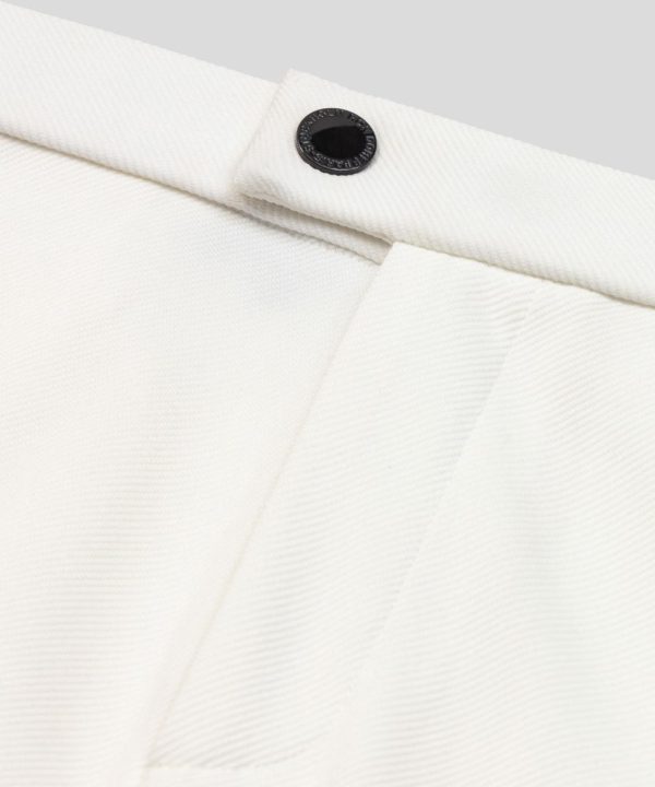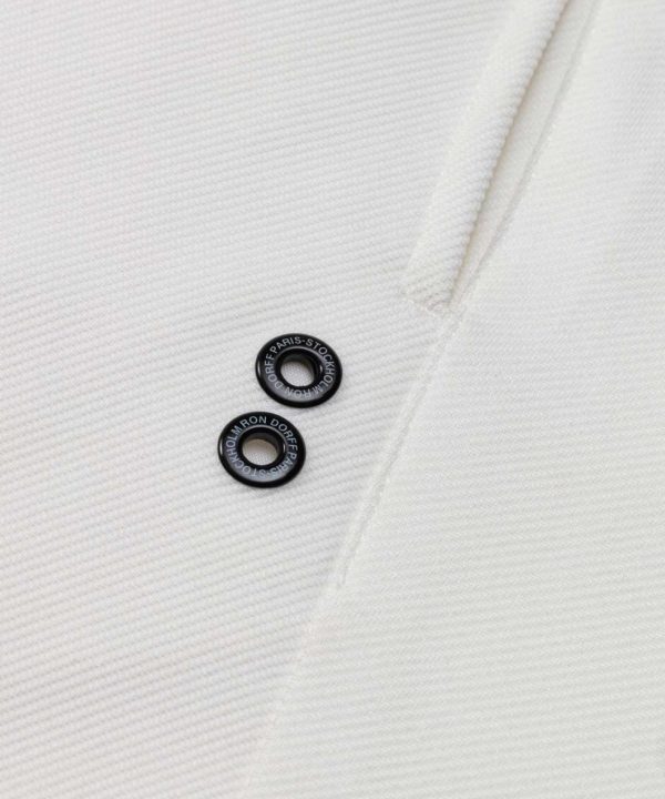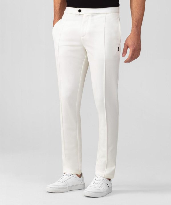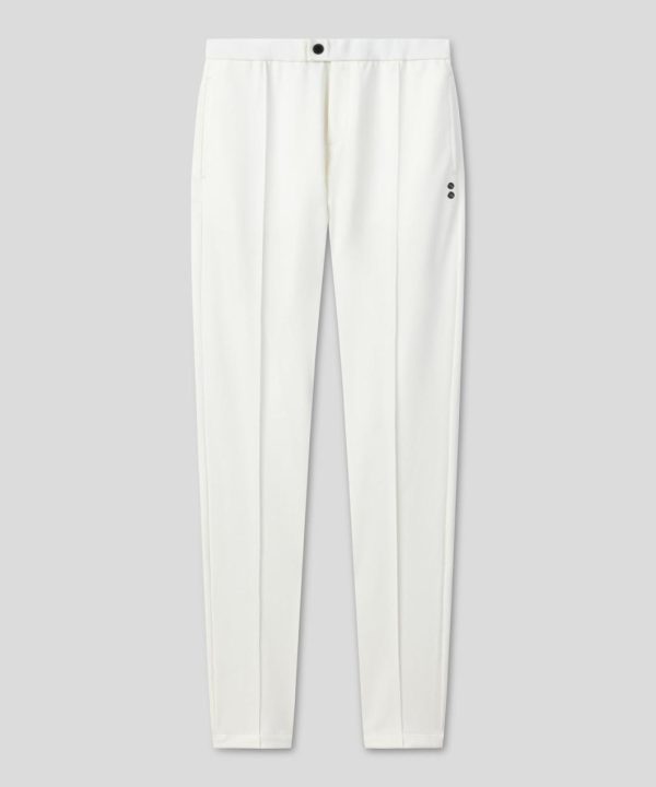 The new pants version of the iconic RD tennis shorts. Designed with a slightly tapered fit and cut in a breathable stretch polyester with a hint of elastane. RON DORFF engraved button and two side pockets. Two back pockets. Featuring the two discrete black-lacquered RD eyelets on the side.