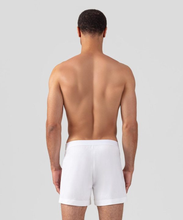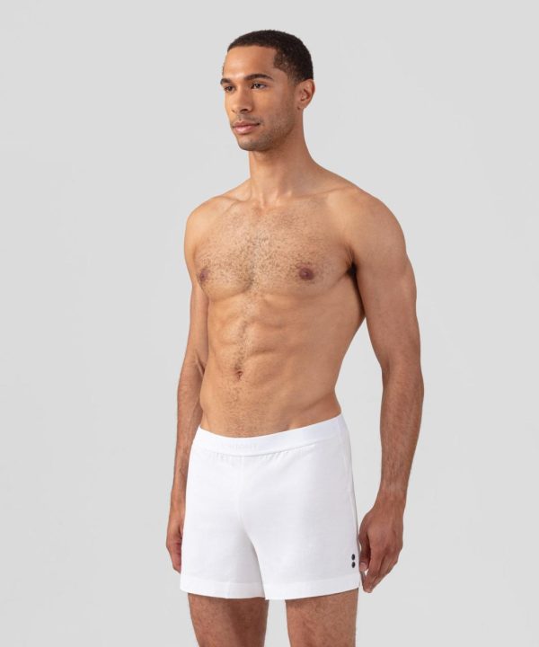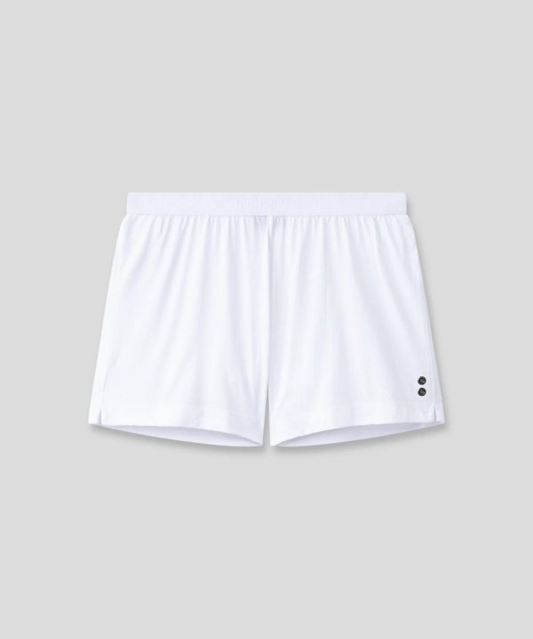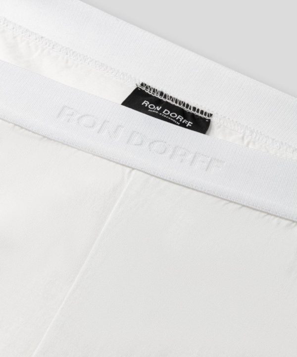 The new pyjama shorts made in 100% ultra-soft cotton jersey with a white elastic waistband branded RON DORFF in black, tone on tone. Ideal for use at home. No back or side pockets and two discrete black-lacquered RD eyelets on the side.