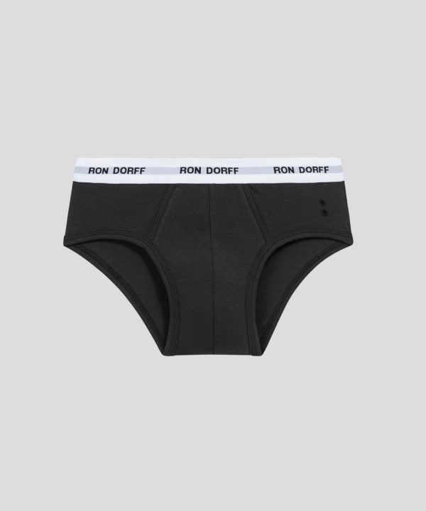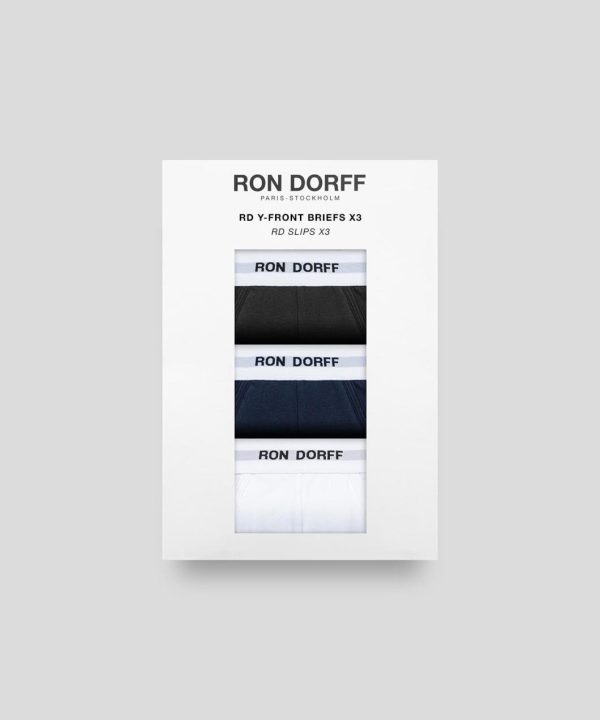 The new Y-front briefs RON DORFF. Inspired by the model developed for the Swedish Army in the 70s, with a white waistband branded RON DORFF in black. Fly opening for maximum convenience. The two discrete, RD eyelets embroidered tone-on-tone on the side. The two discrete, RD eyelets embroidered tone-on-tone on the side. Come exclusively in a Weekend Kit containing 3 briefs – one black, one white and one navy.